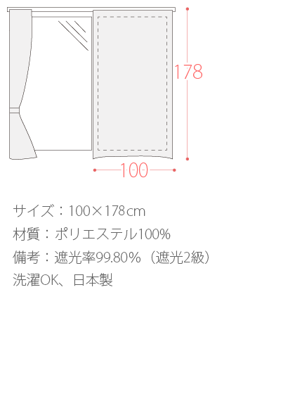 サイズ: 100×178cm 材質: ポリエステル100% 備考: 遮光率99.80%(遮光2級) 洗濯OK、日本製※こちらの商品は2枚セット販売となっております。