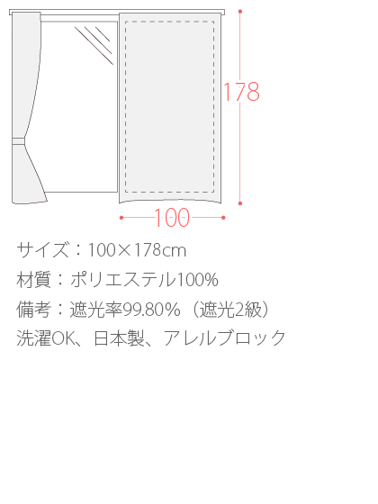 サイズ: 100×178cm 材質: ポリエステル100% 備考: 遮光率99.80%(遮光2級) 洗濯OK、日本製、アレルブロック※こちらの商品は1枚ずつの販売となっております。