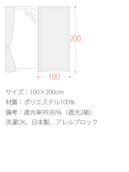 サイズ:100×200cm材質:ポリエステル100%備考:遮光率99.80%(遮光2級)洗濯OK、日本製、アレルブロック※こちらの商品は1枚ずつの販売となっております。